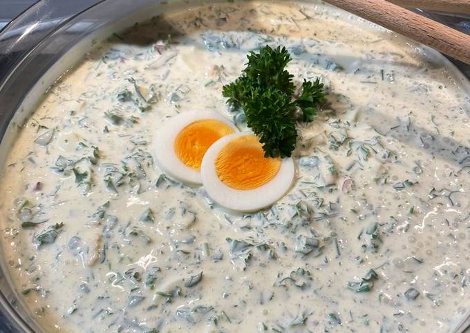 - Die Kräutermischung waschen, trocken tupfen und alles klein hacken. Anschließend unter die Joghurt-Schmand Masse heben. Die ausgekühlten hartgekochten Eier pellen, im Eierschneider in Scheiben trennen und unterrühren. Am besten 12 Stunden ziehen lassen, so entfaltet sich der Geschmack. Auch ggf. nachwürzen..
