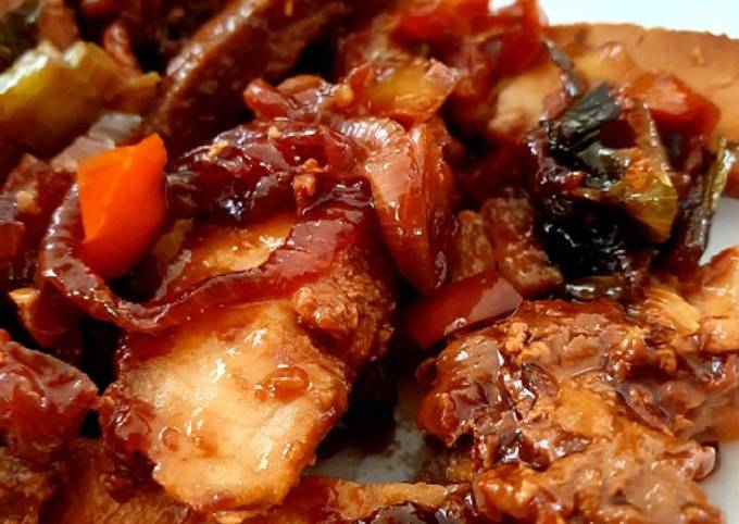 - Nach ein paar Minuten nehmen wir die Koteletts raus und schneiden sie in Streifen, dann wieder in die Pfanne zurück geben. Nach Bedarf noch mehr Sojasauce dazugeben und gut mischen, bis alles gekocht ist und genießen..